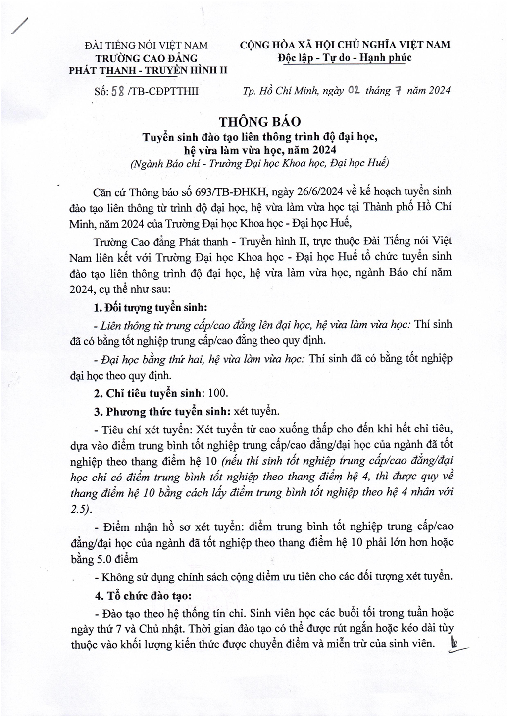 Thông báo tuyển sinh đào tạo liên thông trình độ Đại học, hệ vừa học vừa làm, năm 2024 (Ngành Báo chí - Trường Đại học Khoa học, Đại học Huế)