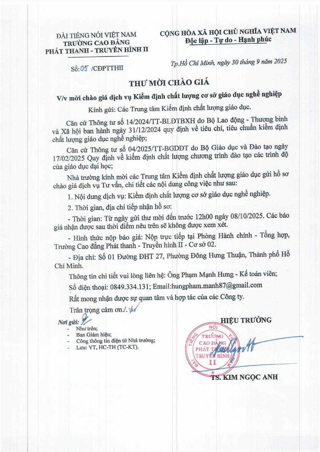 - Thư mòi chào giá về việc mời chào giá dich vụ Tập huấn tự đánh giá và Kiểm định chất lượng cơ sở giáo dục nghề nghiệp (Tải về)
